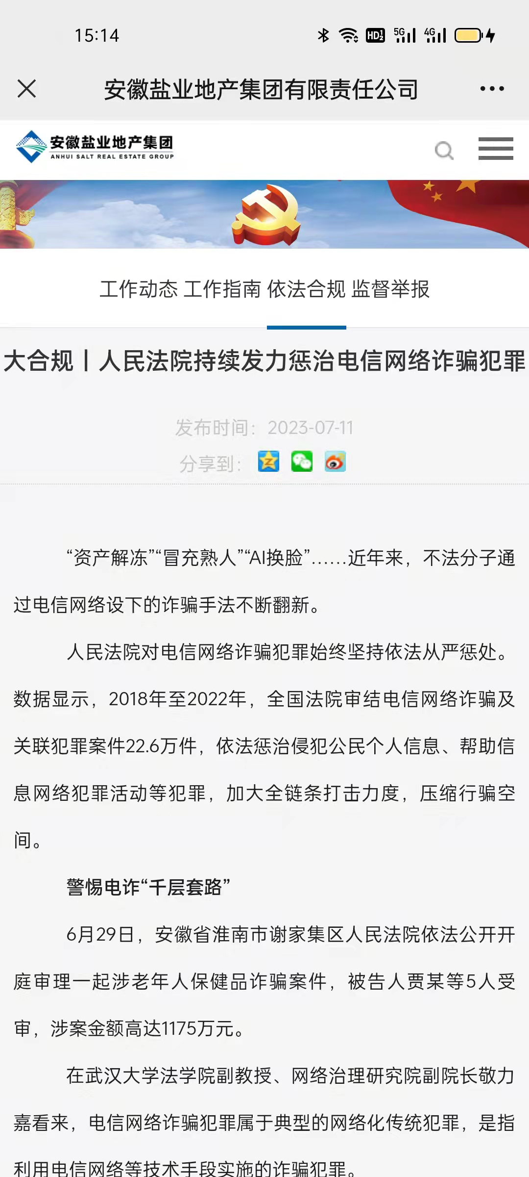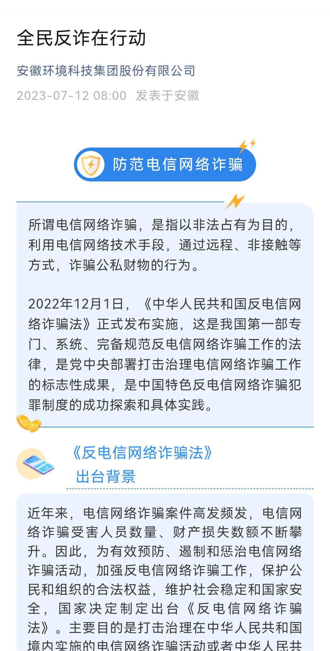 環(huán)境科技集團(tuán)、省健康養(yǎng)老、徽鹽金融等公司通過印制各類反詐宣傳單、宣講防范電信詐騙安全知識,在公眾號發(fā)表普法文章等形式,號召全體員工增強(qiáng)防范意識。