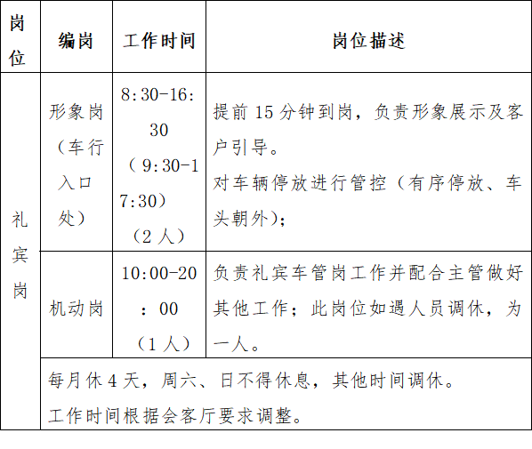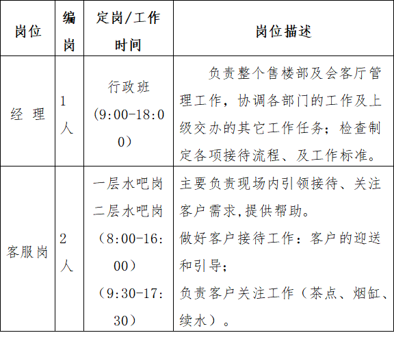 (3)客服崗:選派的客服人員必須經過專業(yè)技能培訓,身體健康,品行良好,無違法違紀犯罪前科,具有初中以上文化程度,年齡在21至45周歲、身高1.65米以上。對現場的客戶接待服務工作有一定的意識。