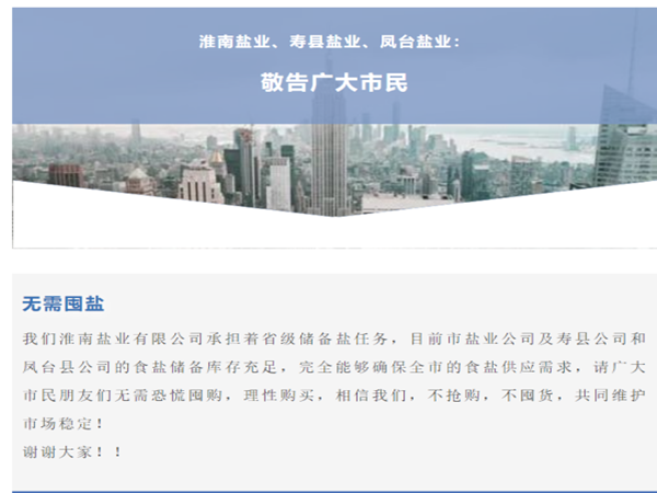 為有效阻止食鹽搶購(gòu)風(fēng)波蔓延,全省各級(jí)鹽業(yè)公司一方面充分利用微信公眾號(hào)、地方性媒體、微信朋友圈等線上渠道發(fā)布正面宣傳信息,另一方面積極組織人員進(jìn)商超、下市場(chǎng),通過面對(duì)面的宣傳形式,引導(dǎo)廣大消費(fèi)者不搶購(gòu)、不囤貨、理性購(gòu)鹽。