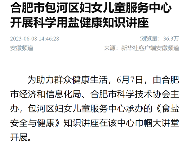 6月8日,新華社客戶端安徽頻道發(fā)表題為《合肥市包河區(qū)婦女兒童服務(wù)中心開展科學(xué)用鹽健康知識講座》的文章,截至發(fā)稿日瀏覽量達(dá)40.7萬人次。