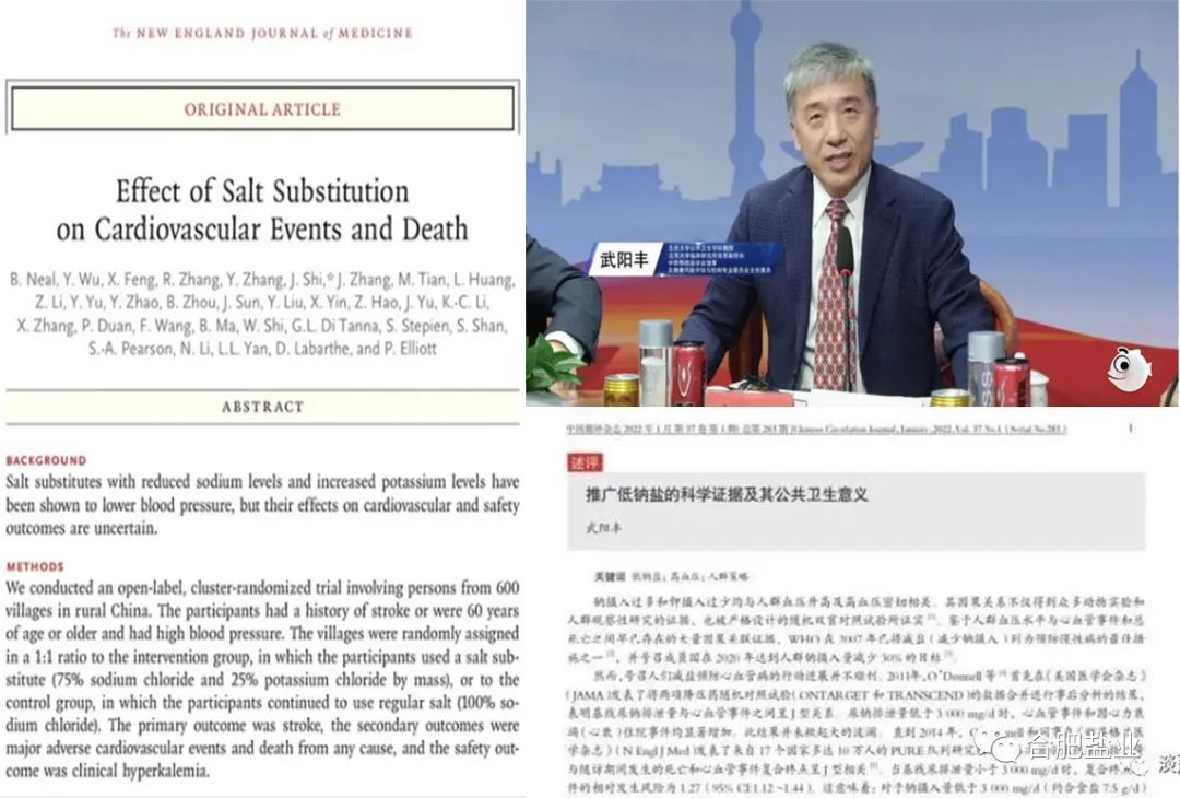 2014年,北京大學等多所中外大學開展了一項低鈉鹽研究,在中國北方600個村莊,挑選了2萬多名60歲以上,有高血壓、腦卒中基礎病的老人做志愿者,把他們分成兩組,一組免費供應食用低鈉鹽,一組免費供應食用普通食鹽,項目持續(xù)跟蹤了5年,5年里有4000多名老人因病去世,因為他們本就有比較重的基礎病,經(jīng)過對比,食用低鈉鹽這組老人腦卒中率下降14%、全因死亡率下降12%,因此推廣低鈉鹽被寫入健康中國行動,北京大學的武陽豐教授有個觀點,就是全國普通食鹽都換成低鈉鹽,每年能減少100萬人過早死亡。低鈉鹽研究的論文被發(fā)表在世界四大醫(yī)學期刊-新英格蘭醫(yī)學雜志(NEJM)上。